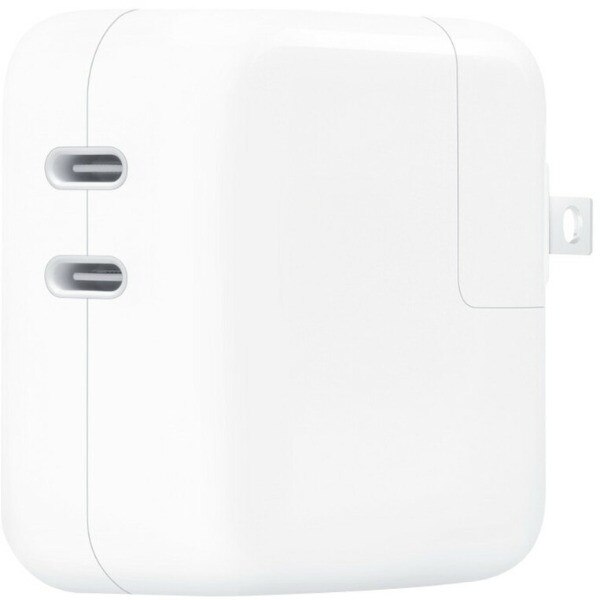 The 35W Dual USB-C Port Power Adapter allows you to charge two devices at the same time, whether you're at home, in the office, or on the go. Apple recommends using it with MacBook Air. You can also use it with iPhone, iPad, Apple Watch, and AirPods.